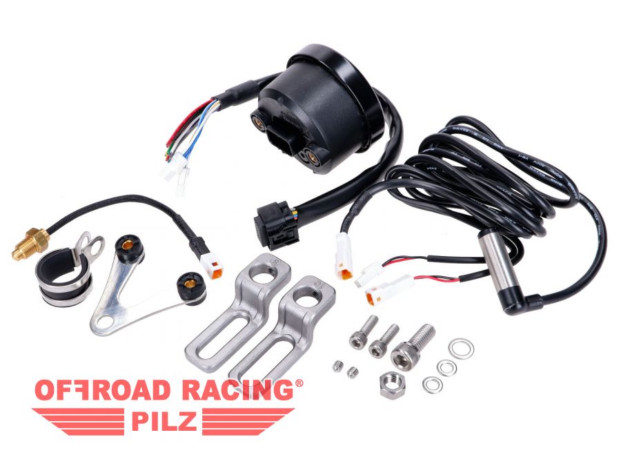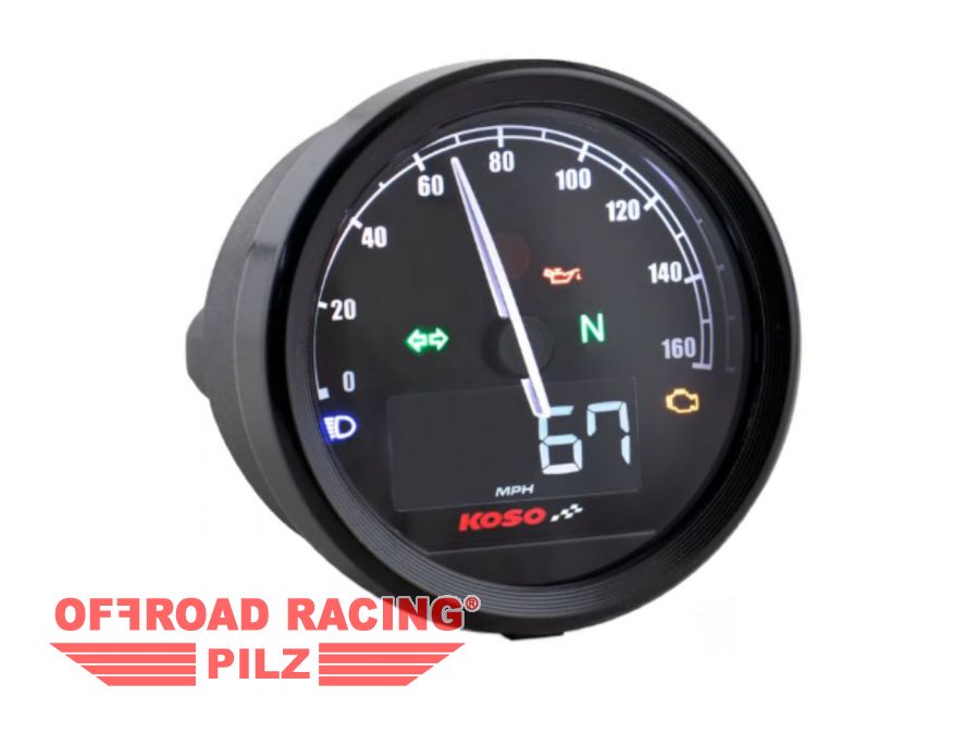 Schwarzer Tacho von KOSO mit 60mm Durchmesser und 160 Km/h Anzeige, universell passend. Im Lieferumfang sind 2 Sensoren sowie das nötige Befestigungsmaterial enthalten. Der Tachometer zeigt die Geschwindigkeit bis 160km/h mit dem digitalen Zeigerinstrument an, die Temperatur (Kühlwasser oder Öl) wird neben dem Kilometerstand in einem gut ablesbaren Digitaldisplay abgebildet. Kontrollleuchten für Blinker, Neutral und Öldruck sowie Kraftstoff werden ebenfalls angezeigt wenn elektrisch angeschlossen.